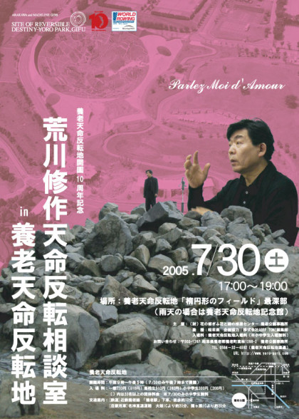今年秋、体験型テーマパークとして岐阜県養老町に建設された「養老天命反転地」は開園10周年を迎えます。これを記念いたしまして、7月30日(土)に制作者である荒川修作の講演会を行います。   第一部は、養老天命反転地の中心部にて制作コンセプトや過程から、この10年を振り返ります。 また現在進めている街づくりプロジェクト「宿命反転都市計画」まで、荒川修作の目指す「死なないための建築」を語る予定