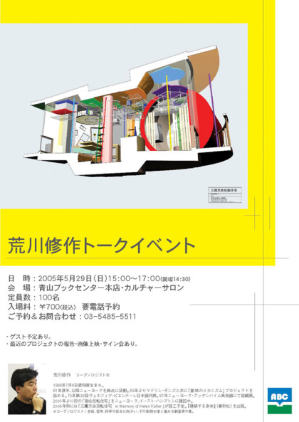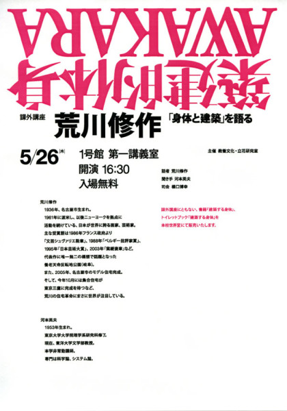 日 時:2005年5月29日(日) 開 場:14:30 開 演:15:00~17:00 会 場:青山ブックセンター本店・カルチャーサロン 講 師 :荒川修作 ゲスト:磯崎 新 ※最近のプロジェクトの報告・画像上映・サイン会あり