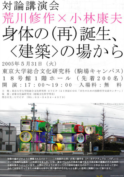 京都造形芸術大学建築デザインコースでは特別講師をお招きして、連続的に特別講義を開催しております。建築デザインコースの皆さんはもちろん、 学外の方も是非ご聴講ください。   日 時:2005年7月31日(日) 開 場:18:00 開 演: 18:30 場 所:京都造形芸術大学 人間館 NA-401 定 員:150名(当日先着順・入場無料) 講 師:荒川 修作(コーデノロジスト)
