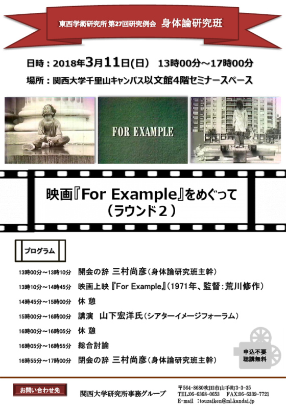 The 6th open research conference will be held on March 11 at the Kansai University (Osaka), which starts with the film screening of “For Example” (1971, Directed by Arakawa, written by Arakawa + Gins) , then having a keynote speech by Koyo Yamashita, Director Image Forum Festival. Please keep you posted on our activities @ […]