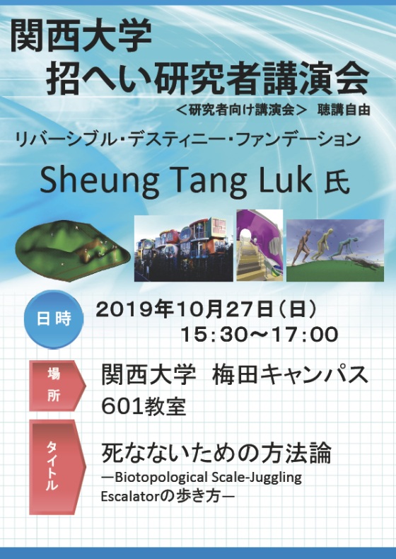 Open lecture by Sheung Tang Luk, Projects manager, Reversible Destiny Foundation, who’s currently in Japan as a visiting scholar at Kansai University. Title: How to walk the Biotopological Scale-Juggling Escalator Date: Sunday, October 27 Time: 15:30-17:00 Venue: Kansai University (Umeda campus #601) Admission: free Language: English *with Japanese interpretation