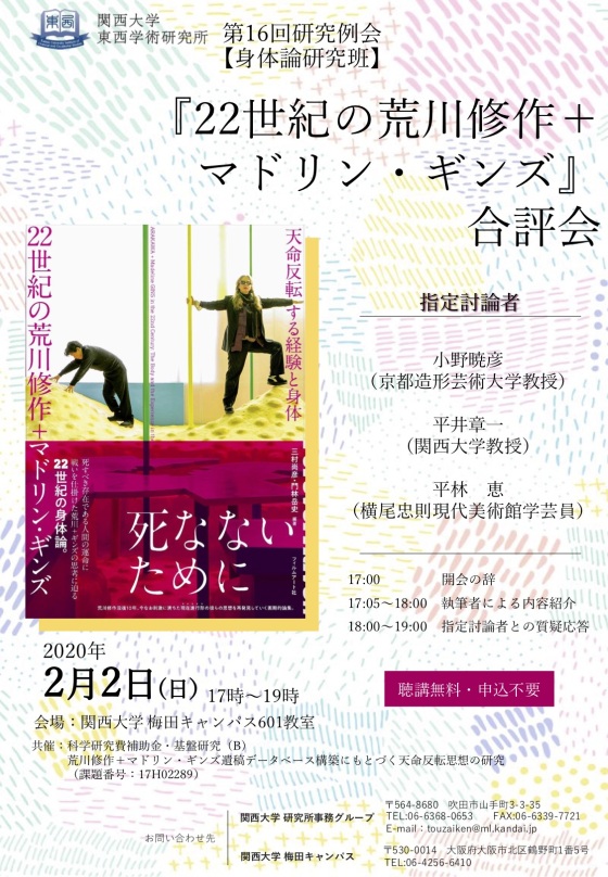 We are pleased to annouce you that the third open research conference @ Kansai University will be held on February 24th, inviting Dr.Jondi Keane, Associate Professor, Deakin University, who was the co-organizer of AG3: The Third International Arakawa and Gins: Architecture and Philosophy Conference (2010). Please keep you posted on our activities @ http://arakawagins.noor.jp/2020agtokyo/?cat=53&lang=en